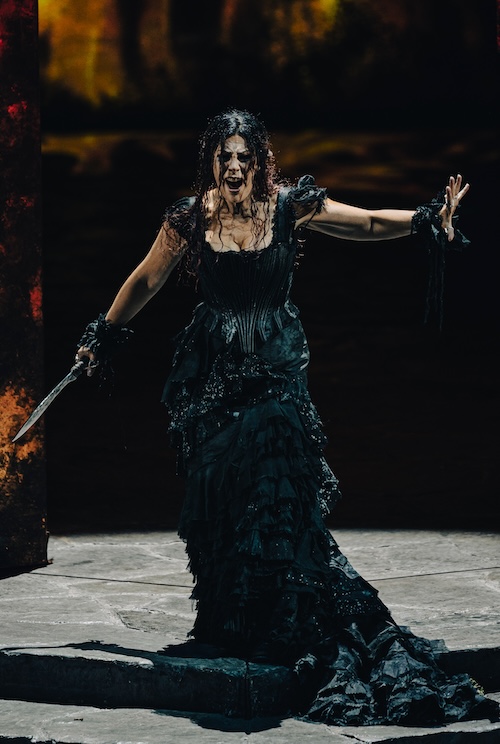 David McVicar’s staging, a co-production with the Met, is characteristic in its dark and moody minimalism. The bare stage and low steps are set off by a towering lacquer wall, which opens to the haven of Corinth but leaves Medea outside, making visually manifest her outcast status. The most striking scenic element is a massive, tilted mirror at the back of the set, that offers a distorted overhead view of the stage action, nicely reflecting the sorceress’s disordered psyche.